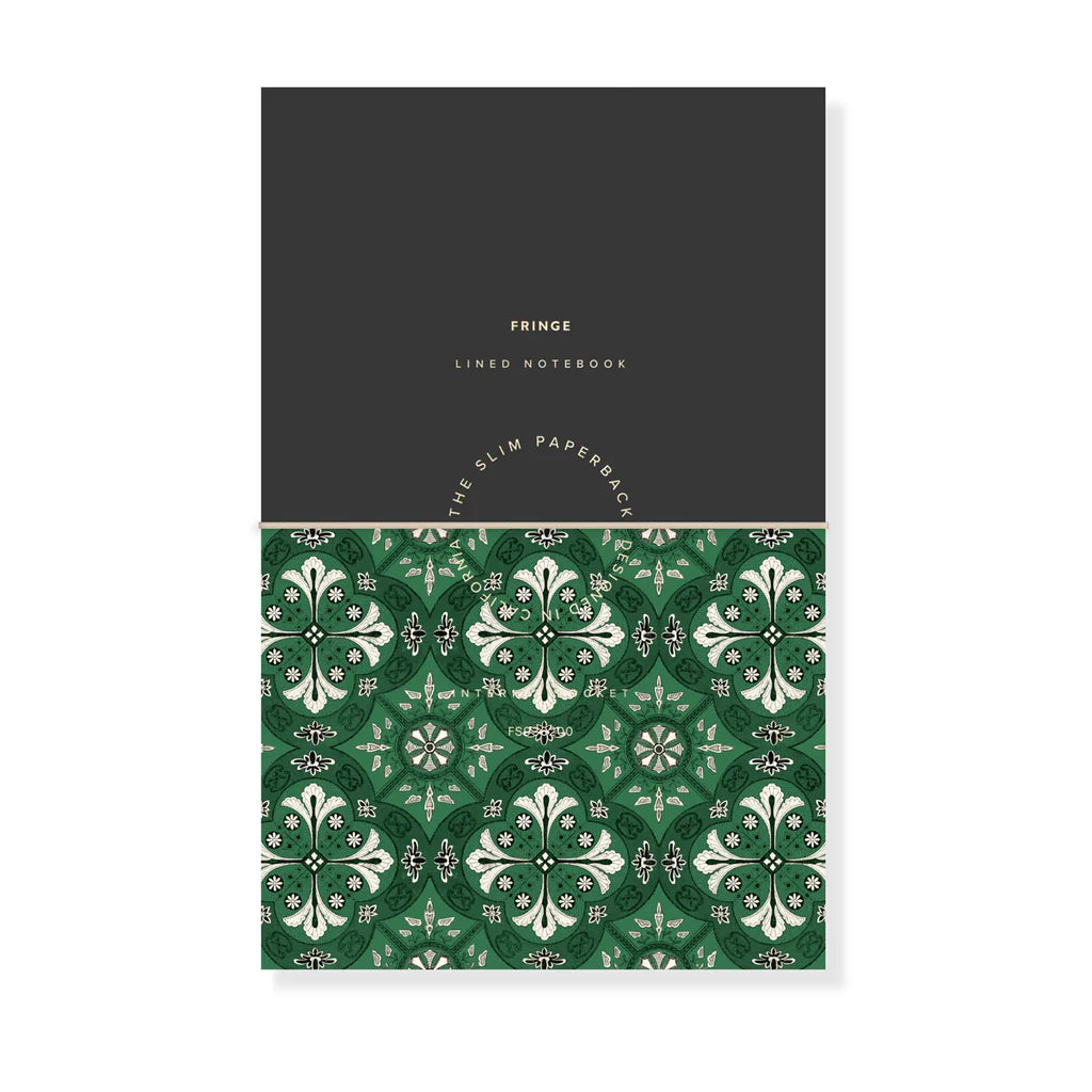 Slim paperback journal with flexible textured cover featuring Fringe original artwork, elastic cord closure, metallic gold foil accent, folded front storage flap, and back pocket.